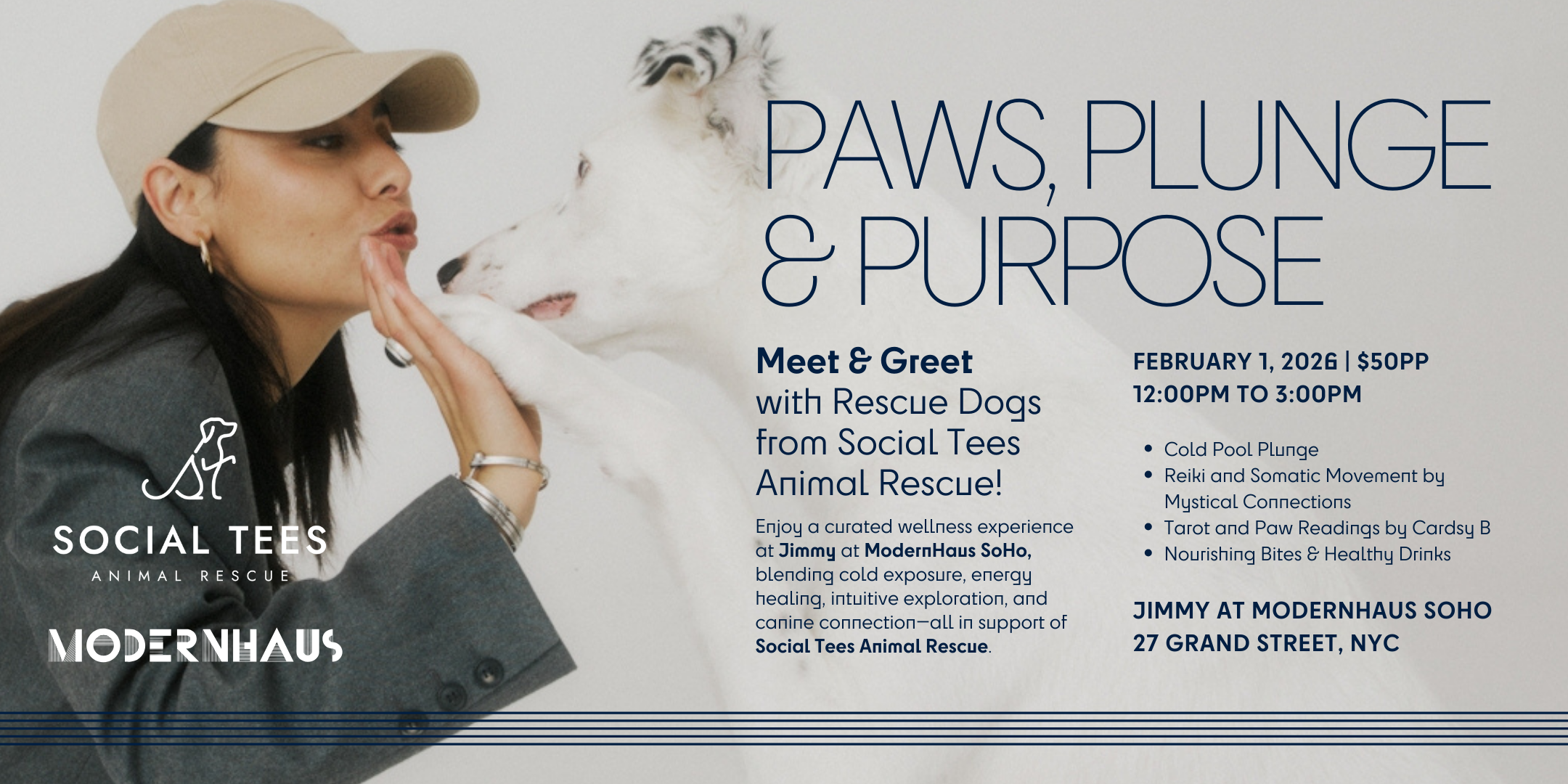 An elevated wellness and community experience centered on intention, connection, and compassion, all in support of our rescue animals. Guests will enjoy a thoughtfully curated atmosphere featuring a cold plunge, tarot readings by Cardsy B, health-forward mocktails, and light bites, designed to nourish the body while maintaining a sense of indulgence and ease.